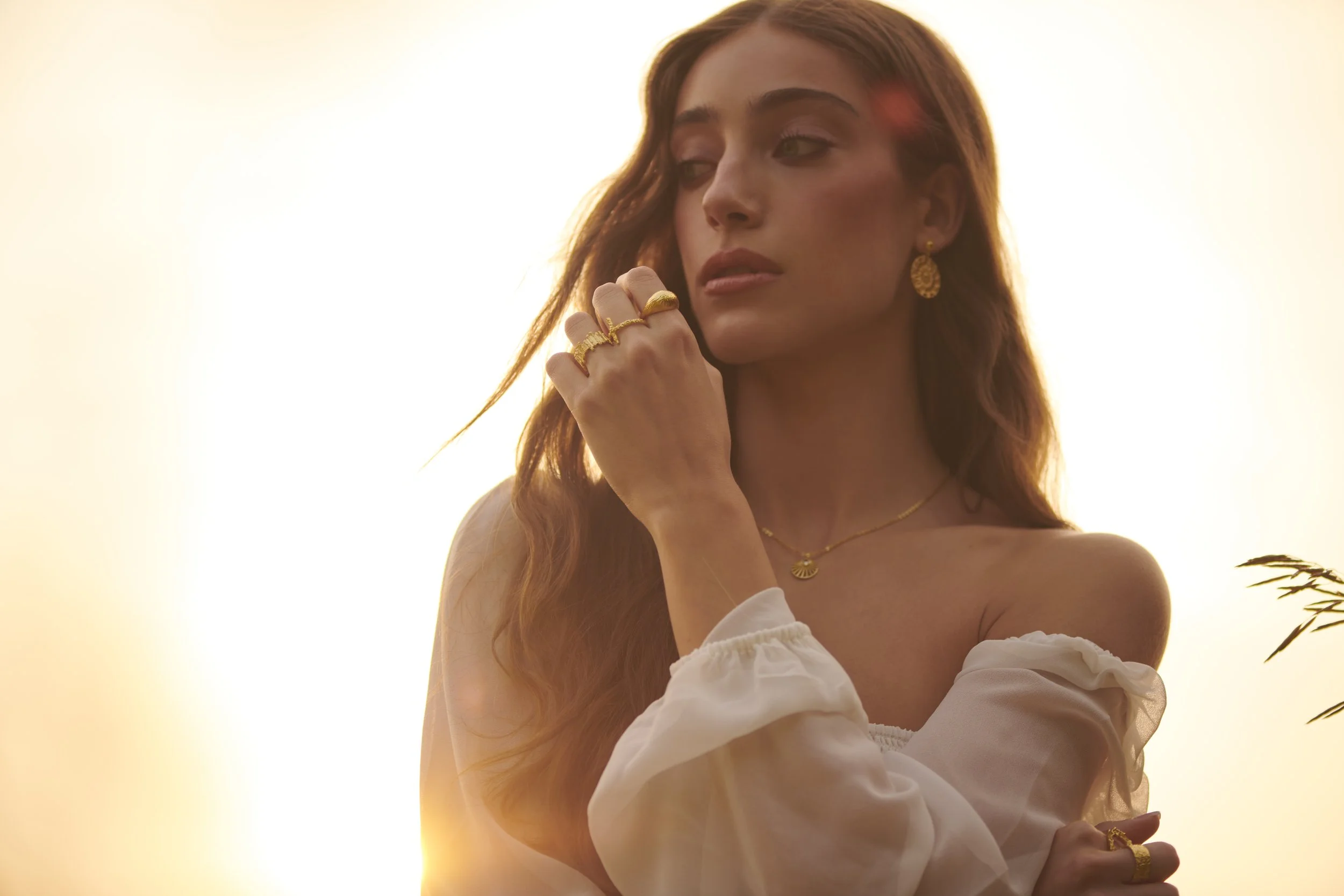 Our Goddess Collection with signature stacking rings, effortless layers, and jewellery that moves with you from sunrise to moonlight.
